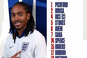 英格蘭首發:1-皮克福德、2-孔薩、5-斯通斯、6-格伊、14-斯賓塞、17-戈登、15-羅杰斯、4-賴斯、21-安德森、7-薩卡、19-沃特金斯