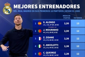 體育資訊10月10日訊 德國轉(zhuǎn)會市場統(tǒng)計(jì)了2000年以來皇馬主帥前16場比賽的勝利場次,并列出榜單,阿隆索13勝居首,穆里尼奧、齊達(dá)內(nèi)、安切洛蒂12勝。