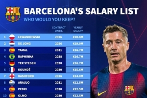 體育資訊10月10日訊 德國轉會市場列出了巴薩球員年薪排名,萊萬2080萬歐居首,德容1900萬歐次席。