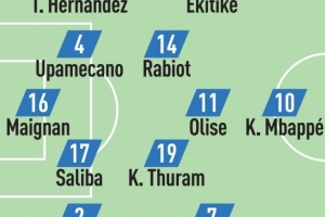 隊報預測法國隊首發:邁尼昂;特奧、于帕梅卡諾、薩利巴、古斯托;拉比奧特、K-圖拉姆、埃基蒂克、奧利塞、科曼;姆巴佩