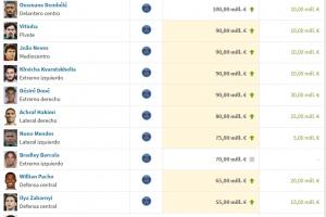 體育資訊10月10日訊 今日德轉更新法甲球員身價,登貝萊身價上漲至1億歐排名法甲第1,維蒂尼亞、內維斯、克瓦拉茨赫利亞、杜埃四人身價高達9000萬歐,法甲身價前10位都為巴黎球員。