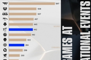 體育資訊10月12日訊 LCP官推發布本次世界賽各戰隊選手參加國際賽事(先鋒賽/MSI/S賽)場次之和,T1居首,GEN第二,BLG位列第三;