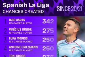 體育資訊10月12日訊 Squawka統計了20-21賽季以來球員在西甲創造機會的次數,并列出榜單,阿斯帕斯342次居首,維尼修斯275次第二。