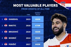 體育資訊10月13日訊 德國轉會市場統計了克羅地亞球員的歷史最高身價,并列出克羅地亞球員歷史身價排名,格瓦迪奧爾8000萬歐居首。