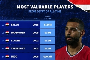 體育資訊10月13日訊 德國轉會市場列出埃及球員歷史最高身價排名,薩拉赫1.5億歐居首,馬爾穆什7500萬歐次席。
