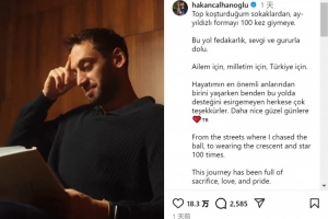 恰爾汗奧盧達成國家隊出戰100場里程碑,他在社交媒體上寫道:“從在街頭追逐足球,到身披星月戰袍(土耳其隊球衣)出戰百場。這段旅程充滿了犧牲、熱愛與驕傲。為我的家人,為我的祖國,為土耳其。”