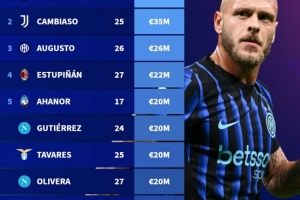 3、奧古斯托(國際米蘭),26歲,2600萬歐元