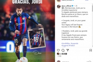 體育資訊10月9日訊 阿爾巴宣布本賽季結束后退役,巴薩名宿、現任總監德科社媒發文祝福。