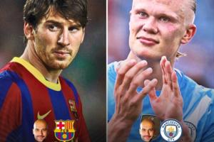 梅西在瓜迪奧拉執教下,在西甲聯賽136場138球55助;哈蘭德在瓜帥執教下,104場英超94球17助。