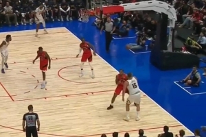 當(dāng)時(shí)約基奇背打,轉(zhuǎn)身之后底線一端單臂大掄傳將球送給另一端的卡梅隆-約翰遜,但后者三分沒(méi)能命中。