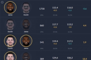 詹姆斯、東契奇同場時,凈效率+1.9